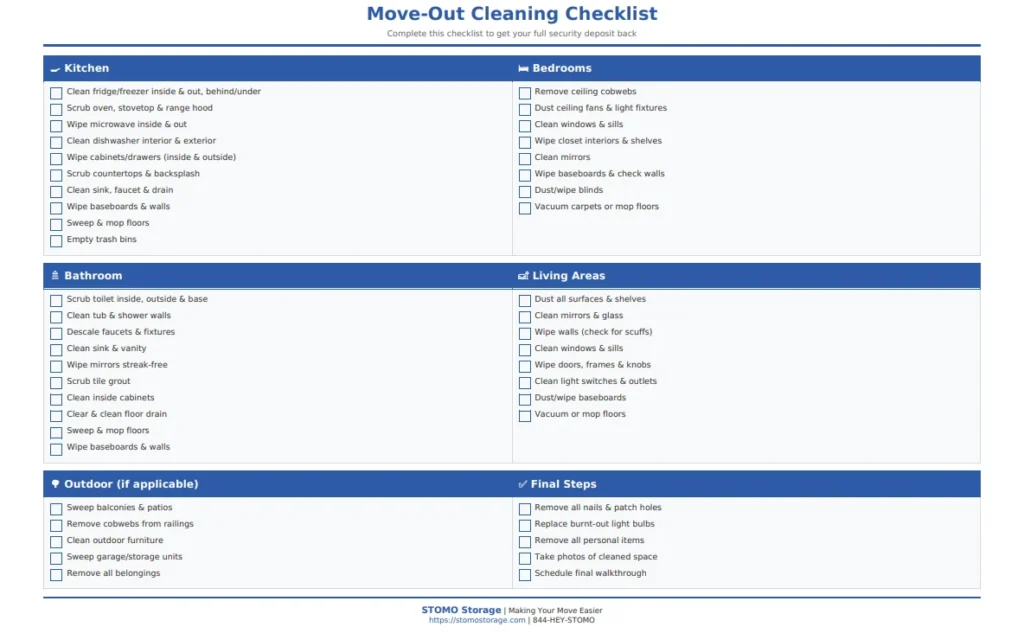 Moving out is stressful enough without worrying about whether you’ll get your security deposit back. Between packing boxes, coordinating movers, and handling paperwork, cleaning your rental often gets pushed to the last minute. But here’s the reality: a thorough move-out cleaning isn’t optional—it’s usually required in your lease agreement, and skipping it could cost you hundreds of dollars in deductions. That’s why we’ve created this complete moving out cleaning checklist to help you tackle every room systematically and get your full deposit back. And if you’re wondering how to clean efficiently while juggling the chaos of a moving day, STOMO Storage’s portable containers can help by giving you the space to work without boxes in the way.